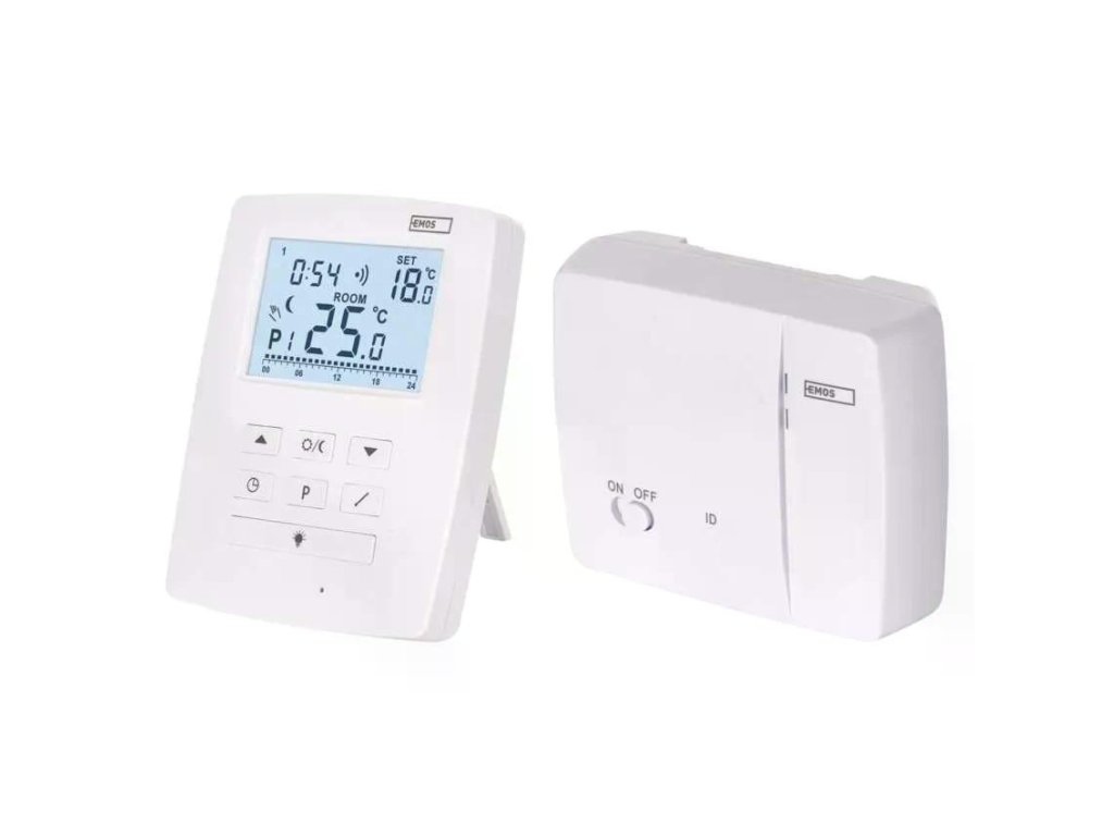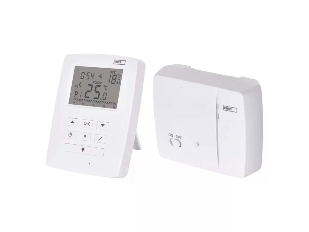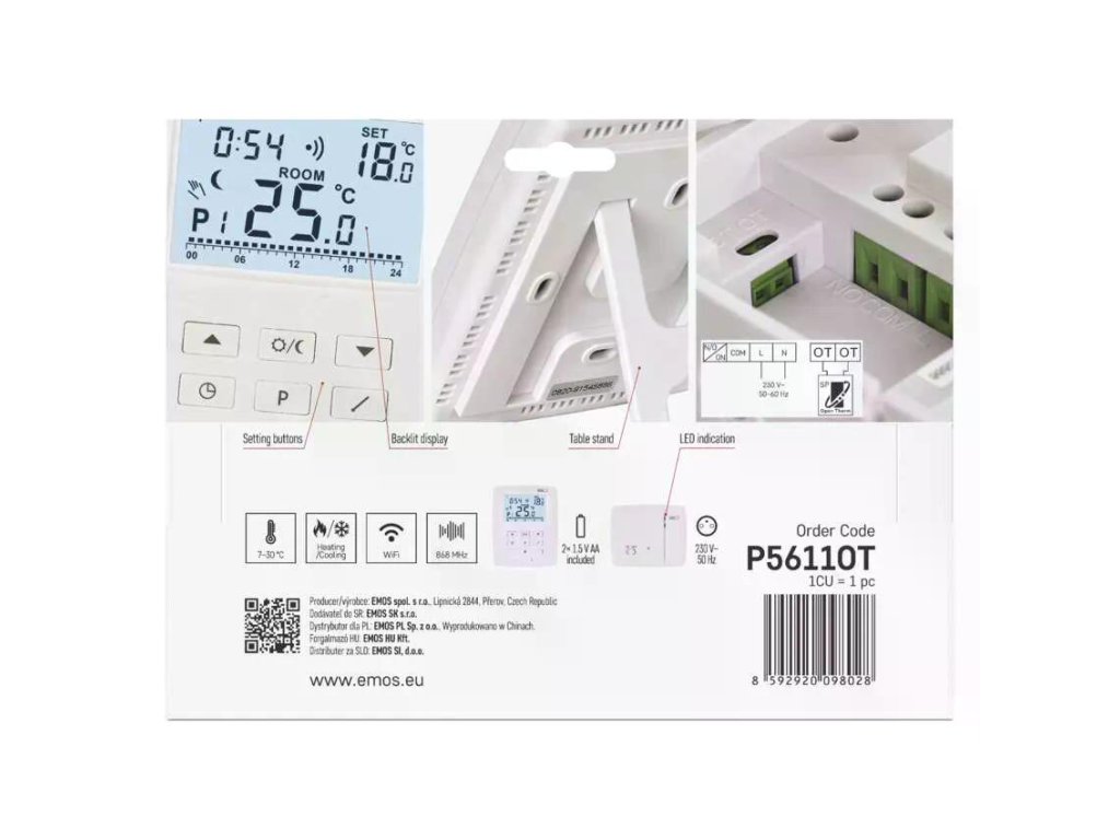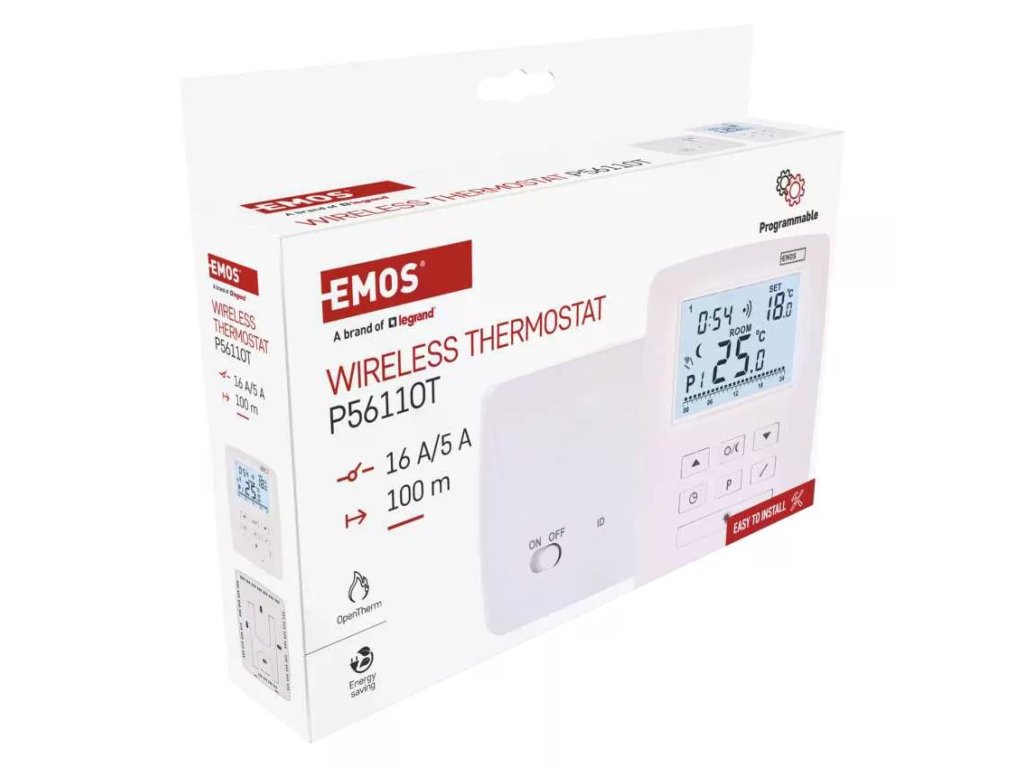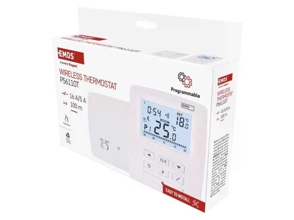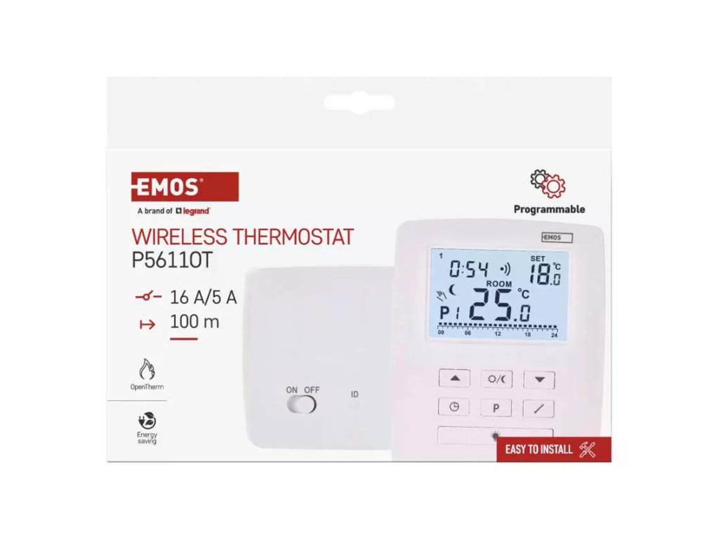 EMOS P5611OT je bezdrátový programovatelný elektronický pokojový termostat s OpenTherm komunikací pro moderní kotle. Podporuje vytápění i chlazení, má podsvícený displej, funkci ON/OFF a ochranu proti zamrznutí. Nabízí 6 + 3 uživatelsky nastavitelné programy s volbou komfortní a úsporné teploty. Měří teplotu v rozsahu 0–40 °C s rozlišením 0,2 °C, nastavit můžete 7–30 °C po 0,2 °C. Nechybí kalibrace teploty. Bezdrátová část běží na 868 MHz s dosahem až 100 m. Spínání je možné na 230 V AC i jako beznapěťový kontakt se zátěží 16 A odporově / 5 A induktivně.