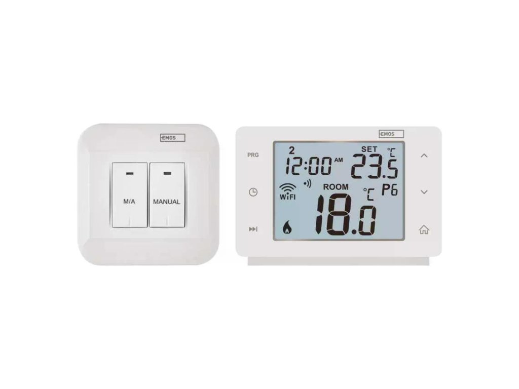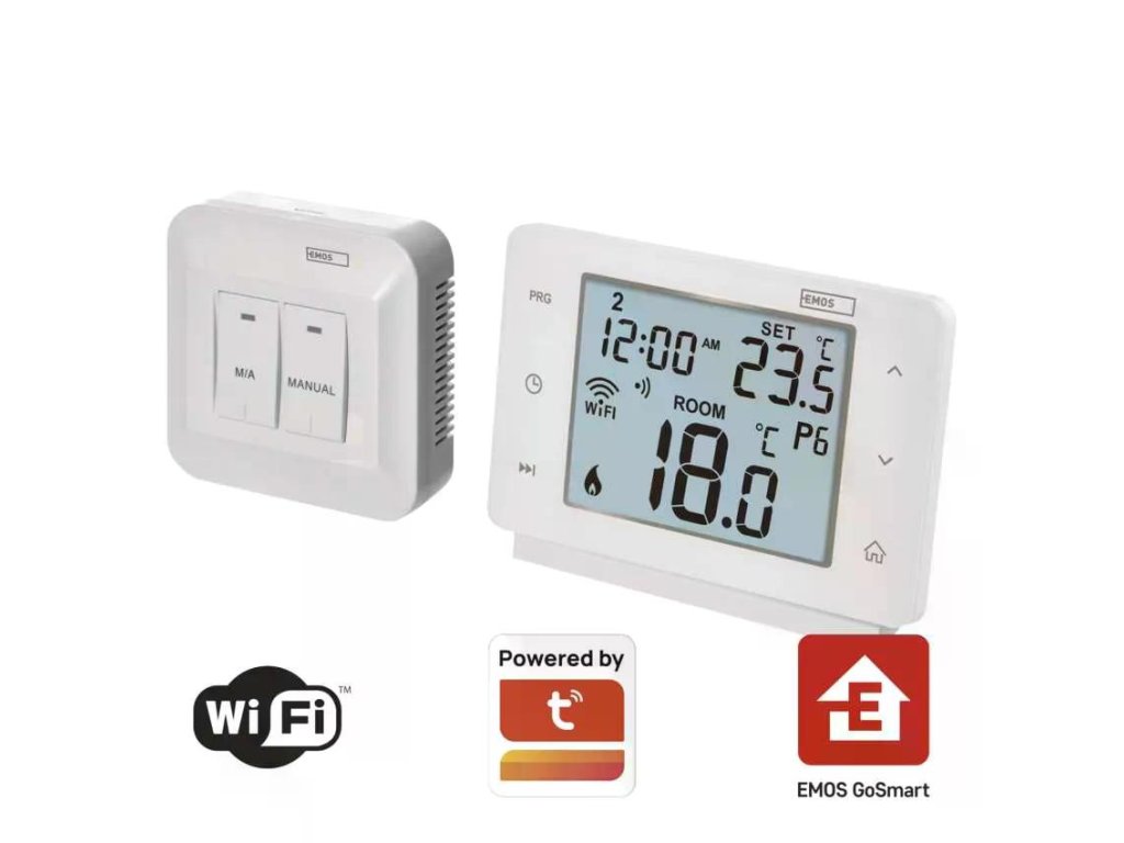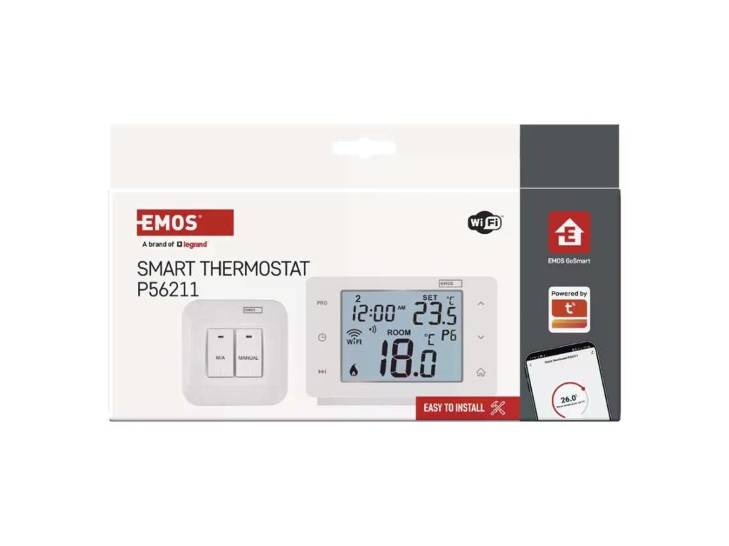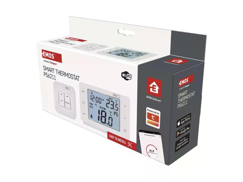 EMOS GOSMART P56211 je bezdrátový programovatelný elektronický pokojový termostat s možností ovládání přes mobil (iOS, Android). Nabízí 6 teplotních změn denně, rozsah nastavení 5–35 °C s krokem 0,5 °C a měření teploty v rozsahu 0–40 °C s rozlišením 0,1 °C. Díky podsvícenému displeji je vše perfektně čitelné. Podporuje vytápění i chlazení, má funkce ON/OFF, prázdniny, ochranu proti zamrznutí a kalibraci teploty. Komunikace probíhá na 868 MHz s dosahem až 100 m a připojení do sítě přes Wi-Fi 2,4 GHz (IEEE 802.11b/g/n). Kompatibilita: EMOS GoSmart, TUYA, LIDL, Smartlife (otevřený systém), podpora hlasových asistentů a notifikací v aplikaci. Balení obsahuje termostat (vysílač), přijímač a napájecí adaptér.