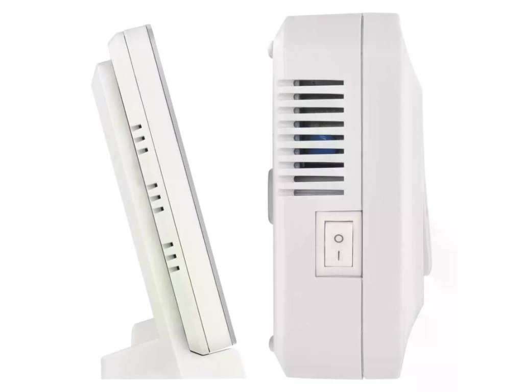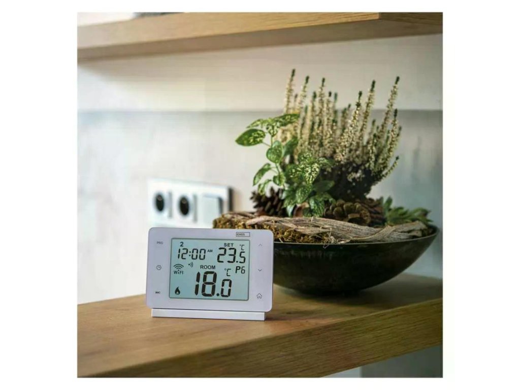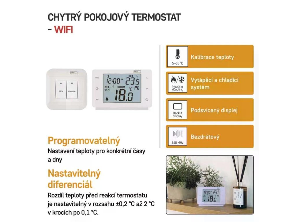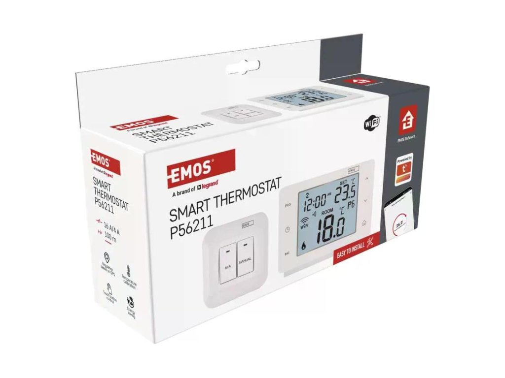 EMOS GOSMART P56211 je bezdrátový programovatelný elektronický pokojový termostat s možností ovládání přes mobil (iOS, Android). Nabízí 6 teplotních změn denně, rozsah nastavení 5–35 °C s krokem 0,5 °C a měření teploty v rozsahu 0–40 °C s rozlišením 0,1 °C. Díky podsvícenému displeji je vše perfektně čitelné. Podporuje vytápění i chlazení, má funkce ON/OFF, prázdniny, ochranu proti zamrznutí a kalibraci teploty. Komunikace probíhá na 868 MHz s dosahem až 100 m a připojení do sítě přes Wi-Fi 2,4 GHz (IEEE 802.11b/g/n). Kompatibilita: EMOS GoSmart, TUYA, LIDL, Smartlife (otevřený systém), podpora hlasových asistentů a notifikací v aplikaci. Balení obsahuje termostat (vysílač), přijímač a napájecí adaptér.