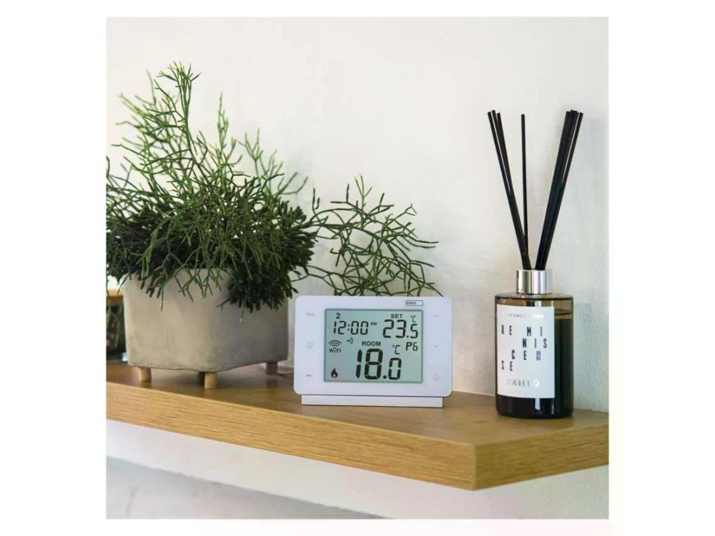 Termostat umožňuje 6 teplotních změn denně s nastavením v intervalu 5–35 °C (krok 0,5 °C). Měření teploty probíhá v rozsahu 0–40 °C s jemným rozlišením 0,1 °C. Nastavitelný rozptyl (hystereze) 0,2–2,0 °C s krokem 0,1 °C pomáhá přizpůsobit regulaci vašemu topnému či chladicímu systému. Podsvícený displej je výborně čitelný i za šera.