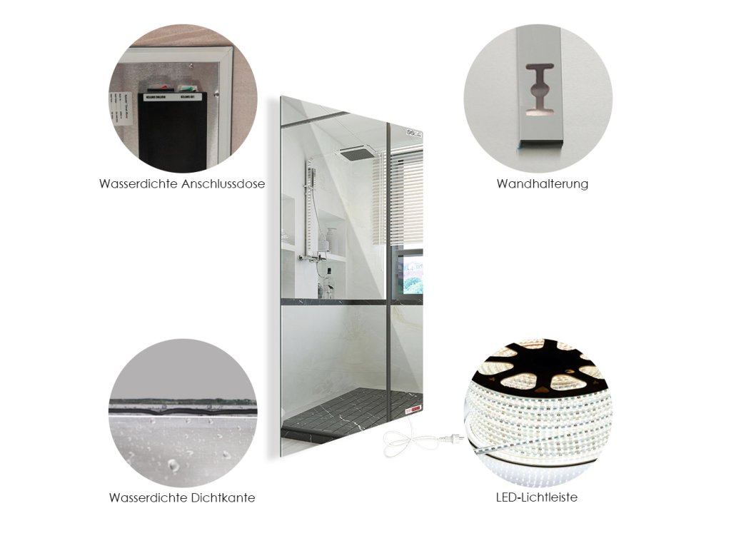 Osvětlení můžete snadno ovládat pomocí tlačítka na zadní straně zrcadla, což eliminuje potřebu instalace externího vypínače a zachovává čistý vzhled místnosti. Duální LED osvětlení nabízí volbu mezi teplou bílou (3000K) a studenou bílou (6000K), což umožňuje přizpůsobit atmosféru vaší koupelny dle aktuální potřeby. Funkce odmlžování zrcadla zajišťuje, že váš odraz bude vždy jasný, i po horké sprše.
