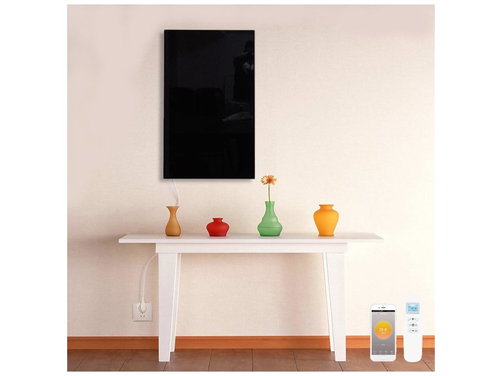 Kategorie: Skleněné • Záruka: 5 let na topné těleso, 2 roky na ostatní • Provedení: Integrovaný WiFi termostat • Výkon: 580 Watt • Rozměry: 1000x600x12 mm • Maximální výhřevnost: 8 m² • Barva: Bílá • Hmotnost: 9.1 kg • Topný článek: Uhlíkový krystal • Povrch: Černé sklo • Rám: Žádný • Zadní strana: Hliníkový plech • Povrchová teplota: 70 - 90 °C • Stupeň krytí: IP54 • Záruka na topné těleso: 5 let • Certifikace: CE, RoHS • Umístění panelu: Na stěnu • Účinnost el. konverze: 98% • Délka vlny: 8 - 15 µm • Délka kabelu: 190 cm zakončený zástrčkou• Úhel záření: Až 170° • Ochrana proti přehřátí: ANO • Napětí: 240V / 50 Hz • Balení obsahuje: Kabel, integrovaný WiFi termostat, konzole pro připevnění na stěnu.